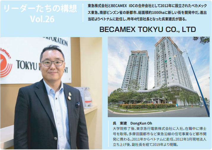東急株式会社とBECAMEX IDCの合弁会社として2012年に設立されたベカメックス東急。南部ビンズン省の新都市、総面積約1000haに新しい街を開発中だ。進出当初よりベトナムに赴任し、昨年4代目社長となった呉東建氏が語る。