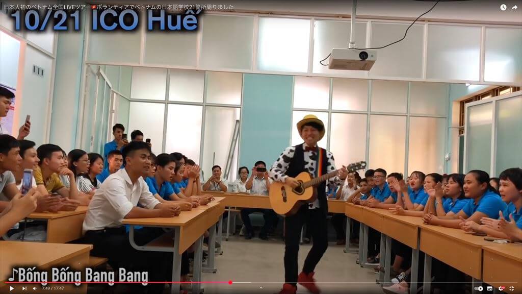Vào tháng 3 năm 2018, tôi lần đầu ra nước ngoài và đến Việt Nam. Vì muốn biểu diễn ở Việt Nam, tôi đăng bài với dòng trạng thái như sau: ‘Tôi sẽ đến các trường Nhật ngữ để biểu diễn, hy vọng được mời tham gia’, và cuối cùng có 2 nơi mời tôi biểu diễn.