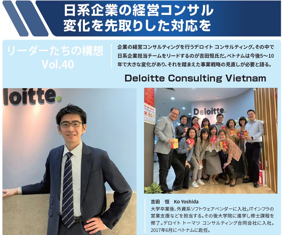 企業の経営コンサルティングを行うデロイト コンサルティング。その中で日系企業担当チームをリードするのが吉田恒氏だ。ベトナムは今後5~10年で大きな変化があり、それを踏まえた事業戦略の見直しが必要と語る。