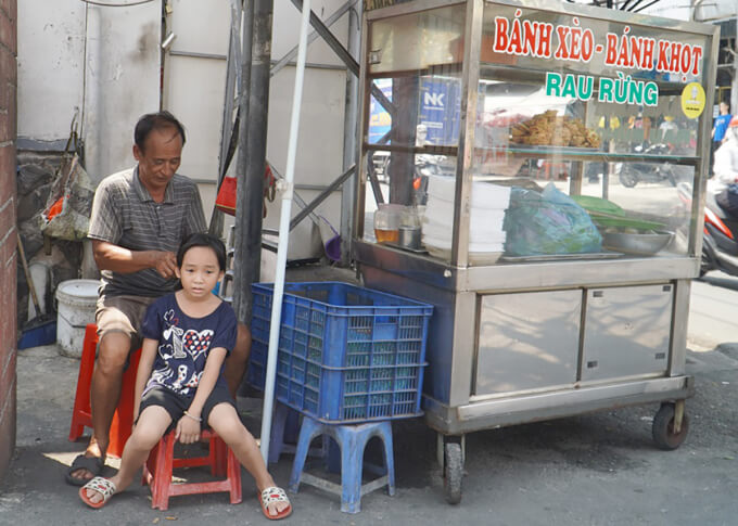 毎日午前11時ごろになるとチューンさん夫妻は、バインセオ(ベトナム風お好み焼き)の屋台を路地の前に準備し、その後ろをトゥーン・ビー(8歳)が野菜の袋持ってついてくる。