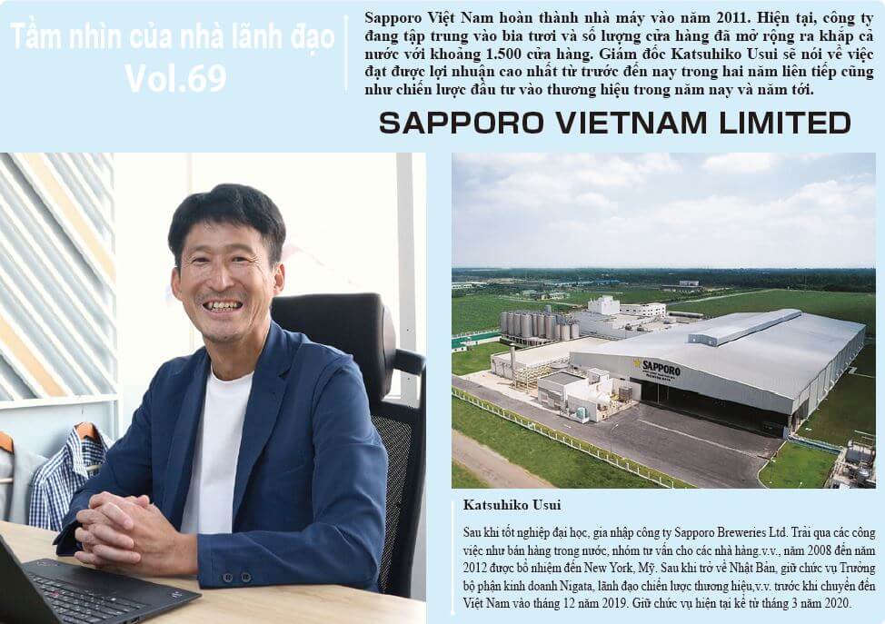 Sapporo Việt Nam hoàn thành nhà máy vào năm 2011. Hiện tại, công ty đang tập trung vào bia tươi và số lượng cửa hàng đã mở rộng ra khắp cả nước với khoảng 1.500 cửa hàng. Giám đốc Katsuhiko Usui sẽ nói về việc đạt được lợi nhuận cao nhất từ trước đến nay trong hai năm liên tiếp cũng như chiến lược đầu tư vào thương hiệu trong năm nay và năm tới.