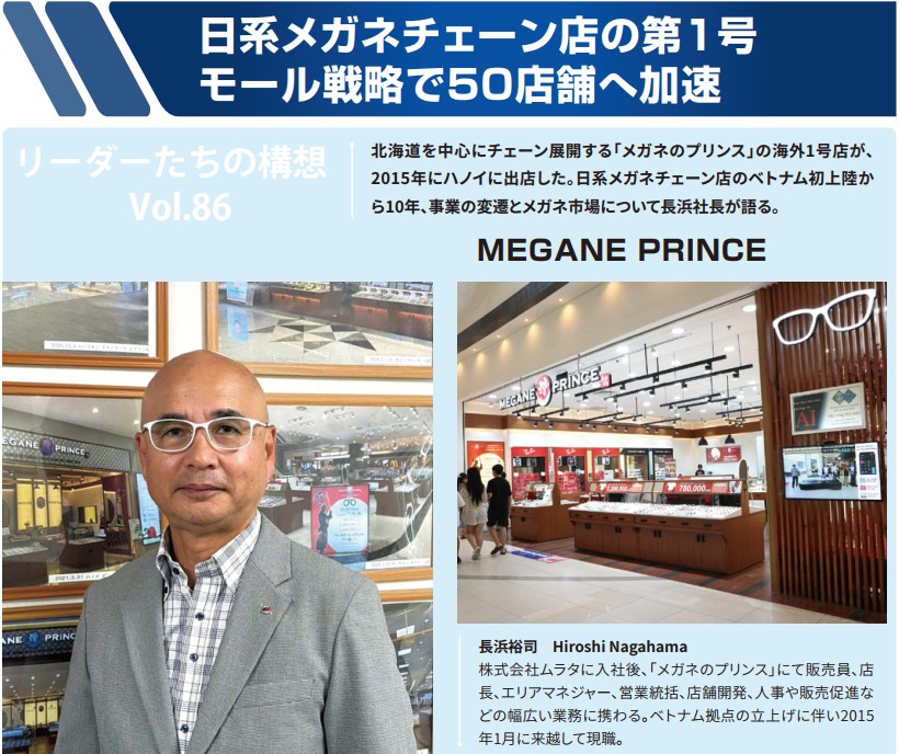 北海道を中心にチェーン展開する「メガネのプリンス」の海外1号店が、2015年にハノイに出店した。日系メガネチェーン店のベトナム初上陸から10年、事業の変遷とメガネ市場について長浜社長が語る。